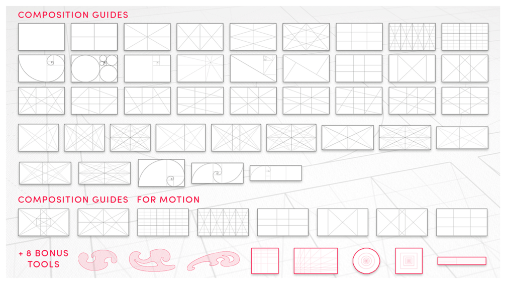 This library compiles the most common guides for achieving great image, artwork and layout compositions. Namely: Golden Ratio, Rabatement, Rule of Thirds, Phi Grids and Root Rectangles. Also, additional grids with focus on Motion- and/or Screendesign aspects.